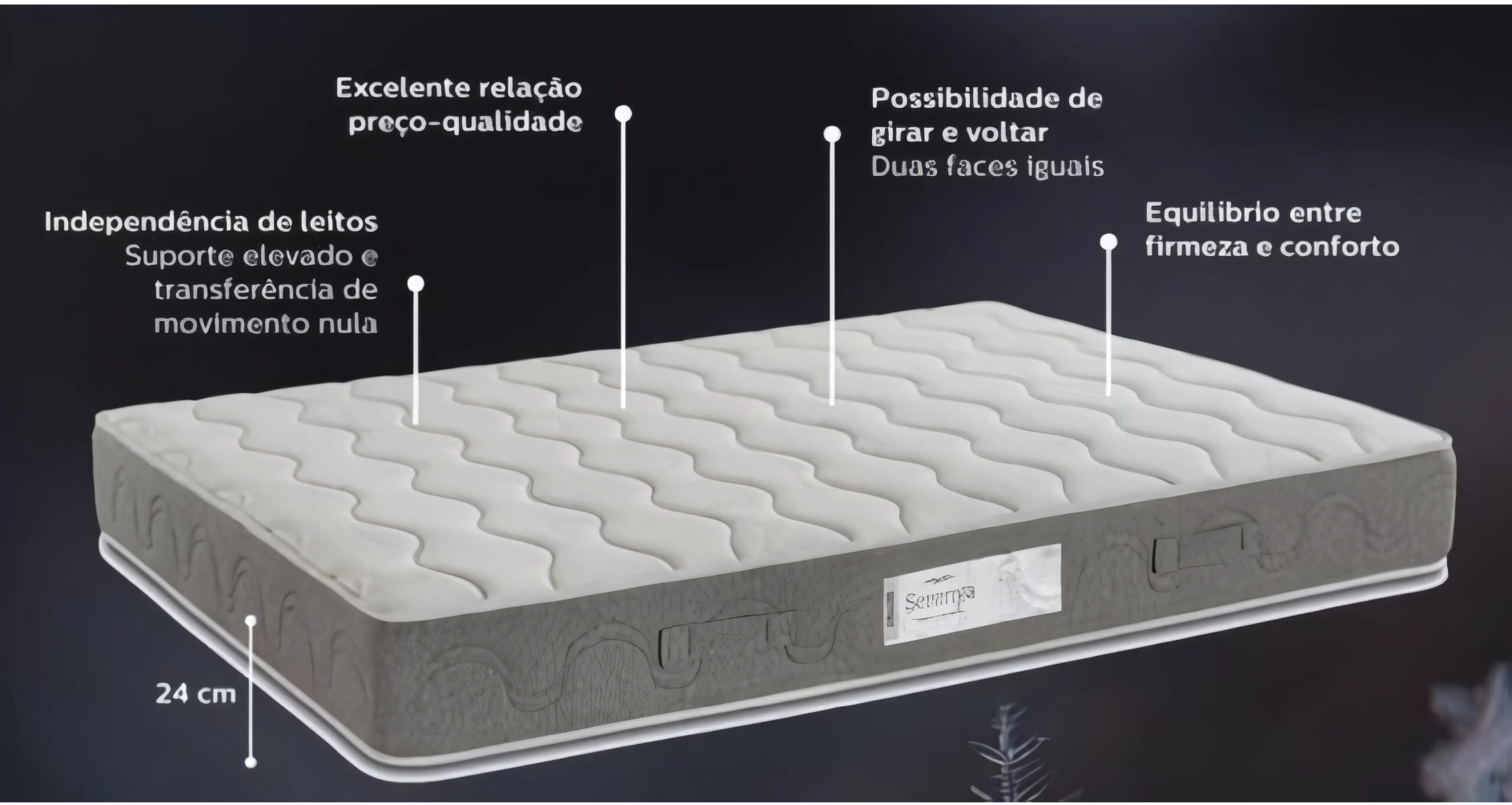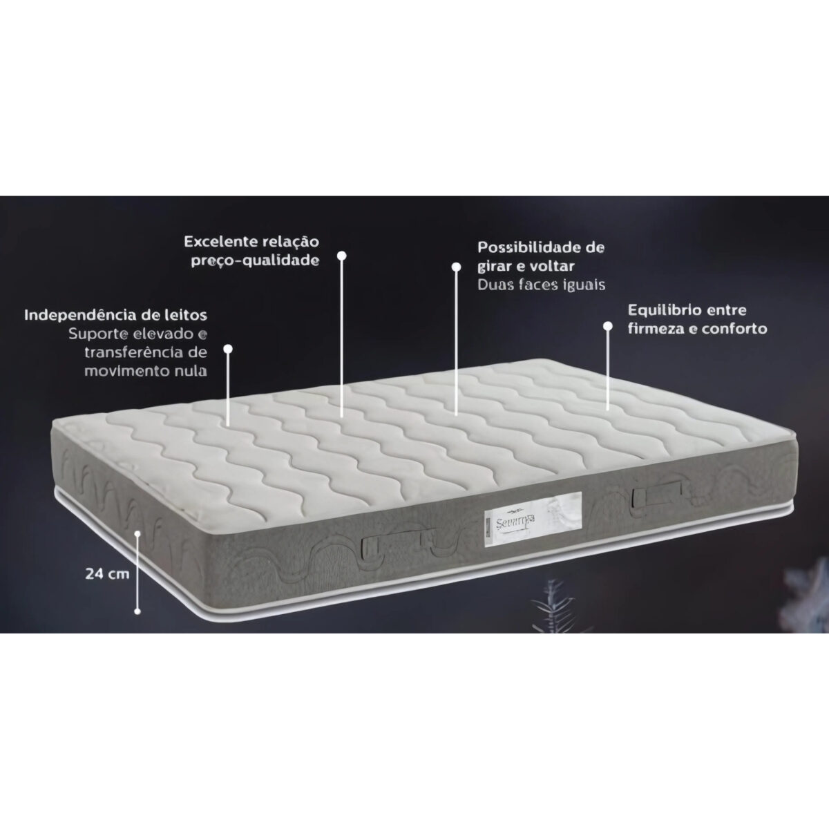 Contituido por fibras hopoalergénicas e espumas D20 soft nos tampos, molas ensacadas com 3 zonas de conforto e um reforço estruturas de 30kg/m³
