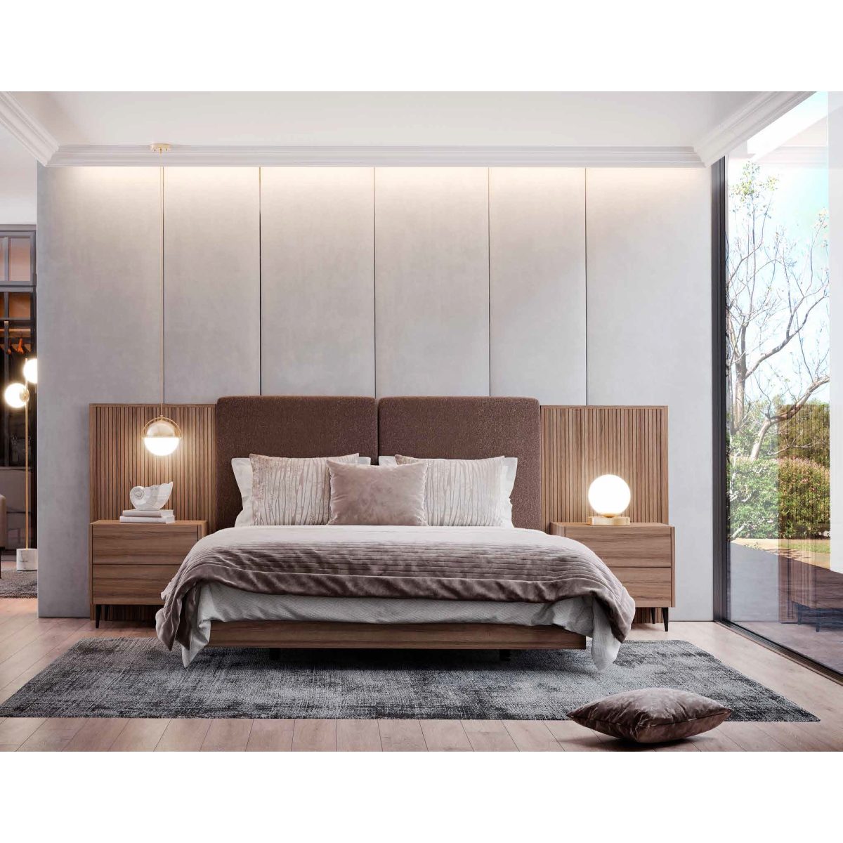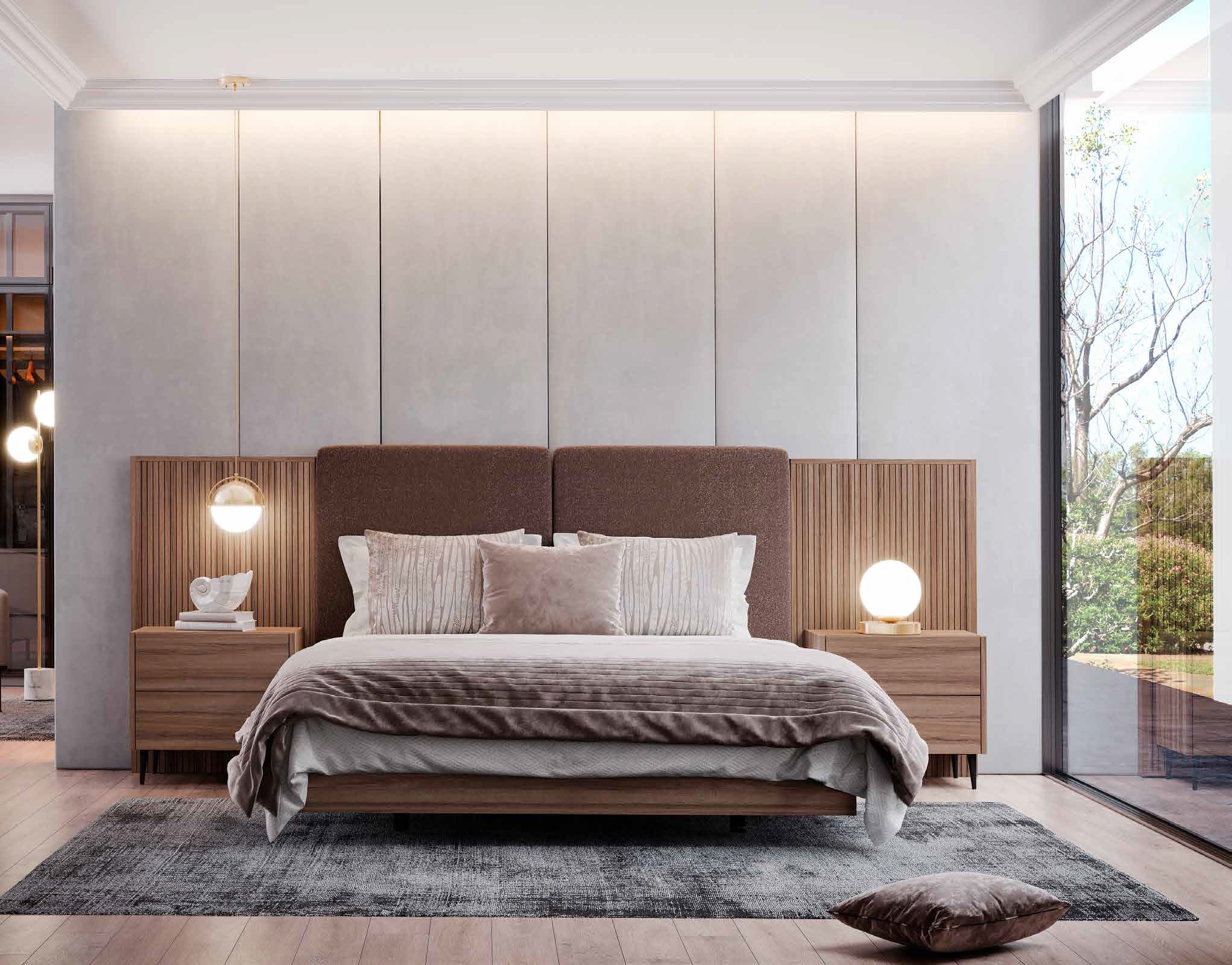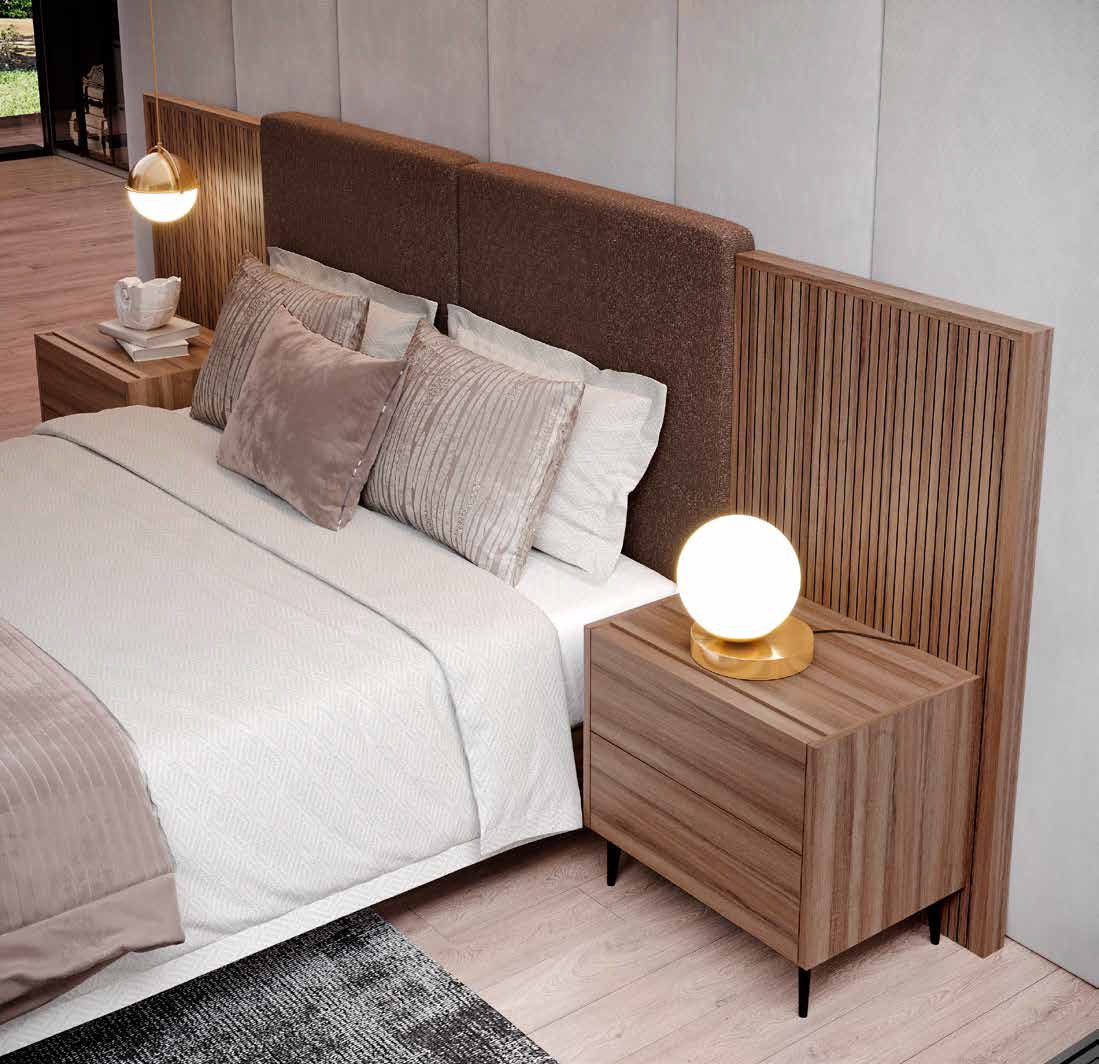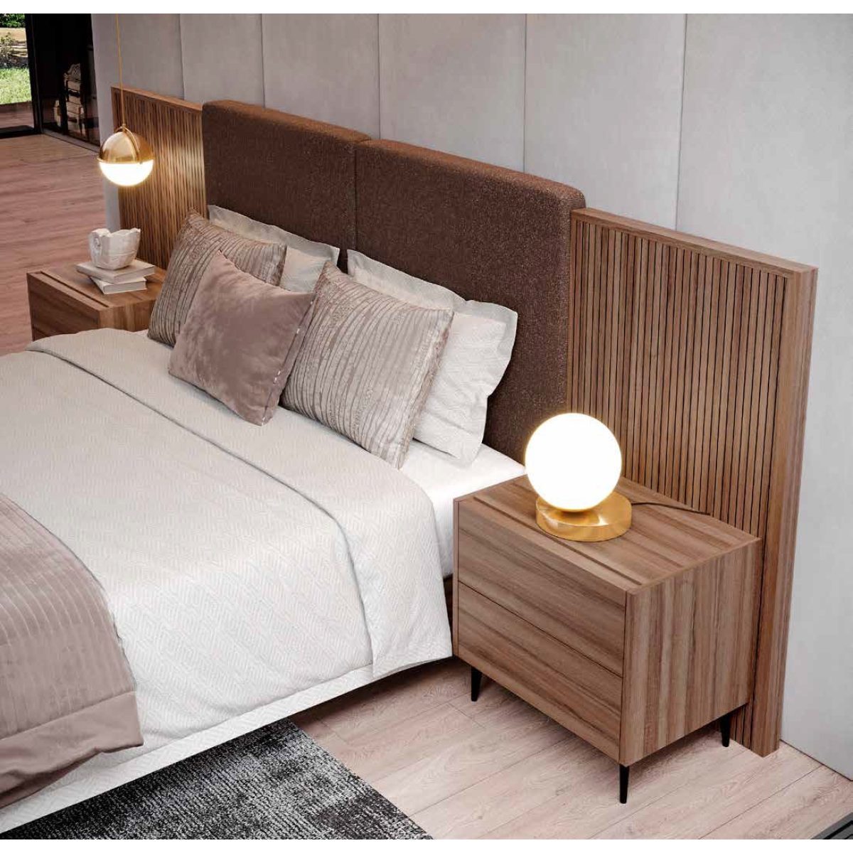 Na imagem temos o acabamento laminado Nogueira Siroko e a cabeceira da cama estofada com tecido Bronx Brown, qualquer uma destas opções é personalizável.