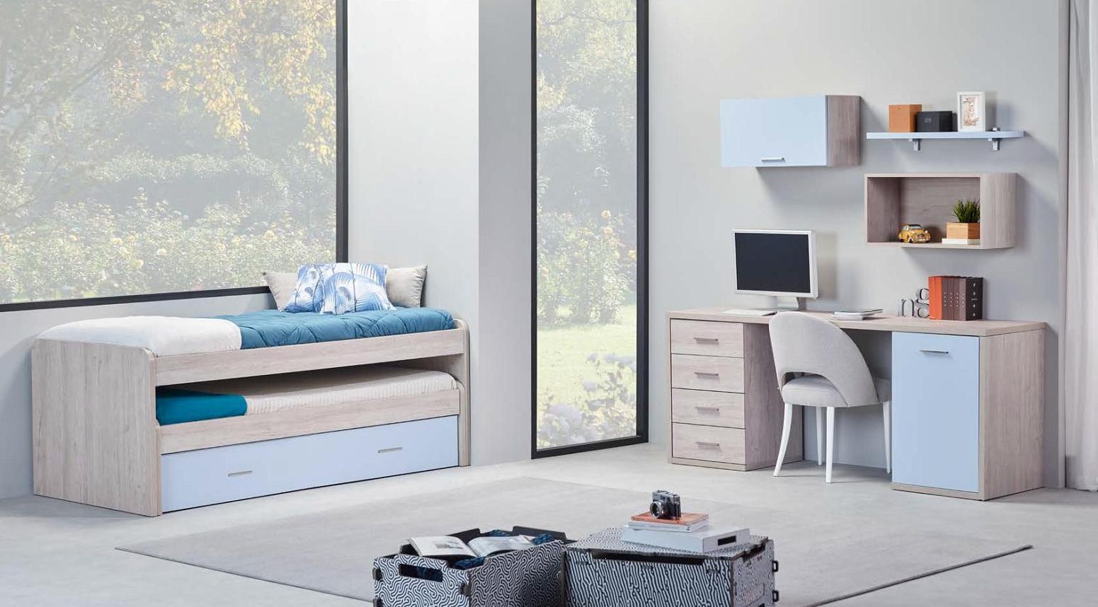 Quarto Juvenil M25 Dimensões: Cama: Para colchão 195*95 Mesa de Cabeceira: L 53 / A 40 / P 40 Secretária: L 120 / A 75 / P 55 Alçado Parede c/ 4 vãos : L 100 / A 69 / P 20 Várias cores ou combinações de cores disponíveis. O Preço inclui apenas a cama. Aproveite para adicionar estrado e colchão à sua encomenda.