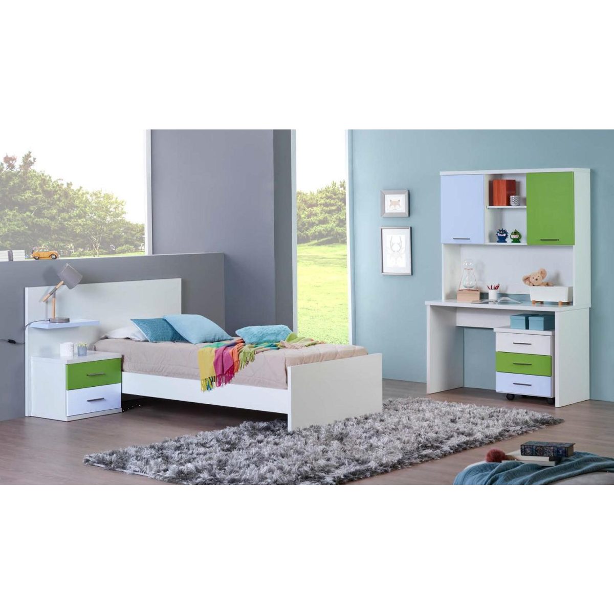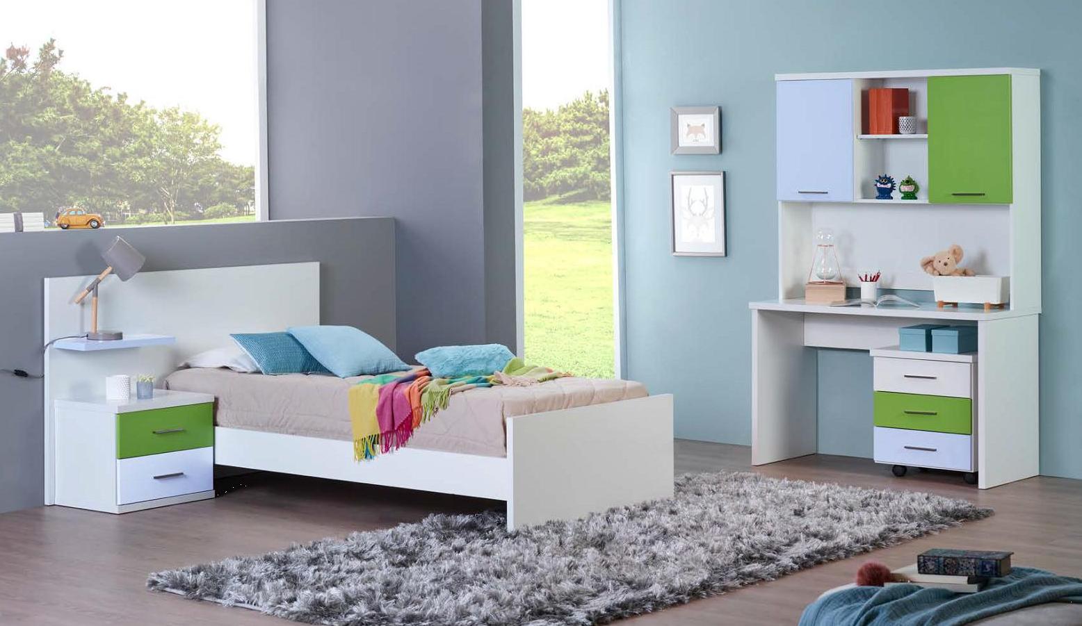 Quarto Juvenil M29 Dimensões: Cama: Para colchão 190*90 Mesa de Cabeceira: L 52 / A 43 / P 39 Várias cores ou combinações de cores disponíveis. O Preço inclui apenas a cama. Aproveite para adicionar estrado e colchão à sua encomenda.