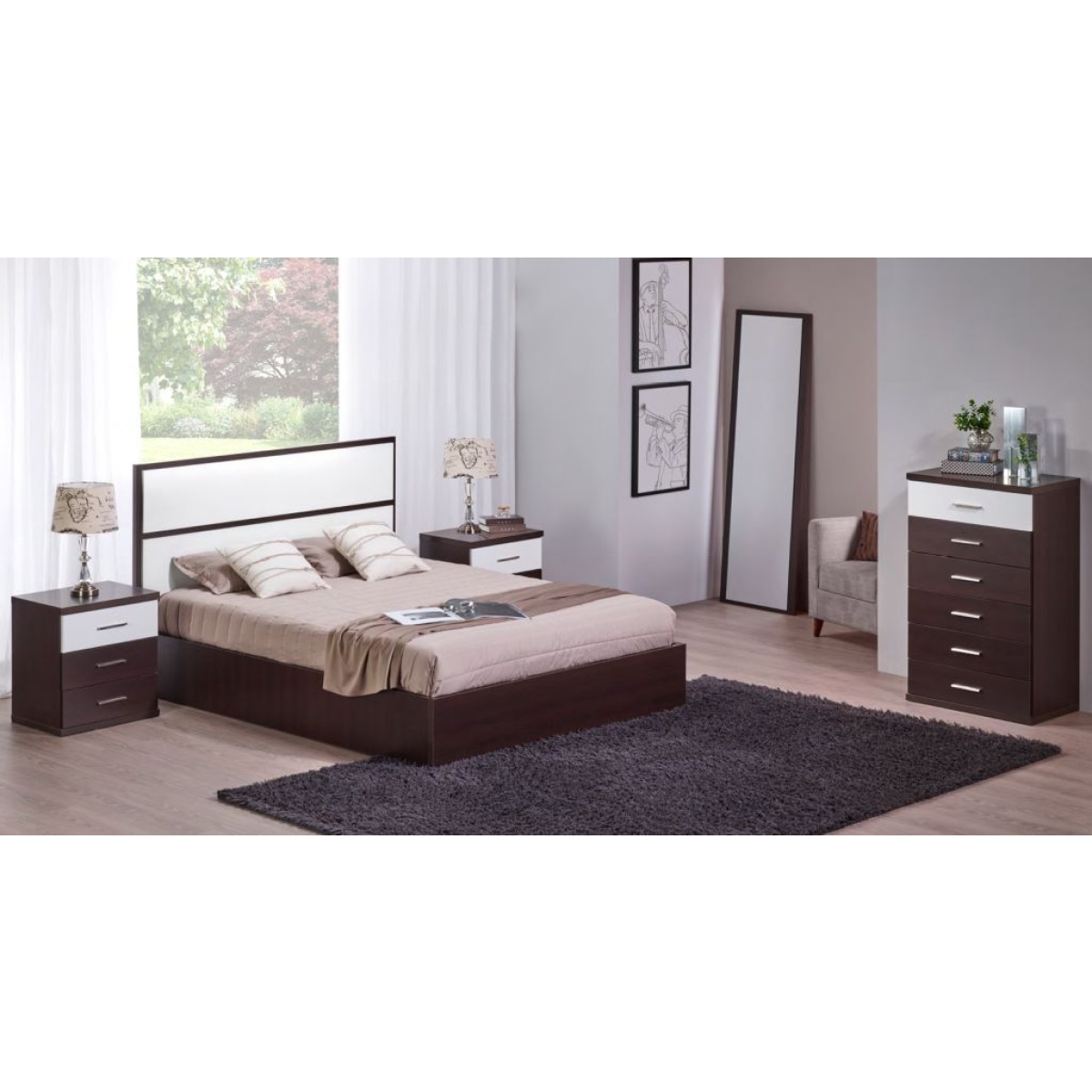 Cama + 2 mesas cabeceira, Cama + 2 mesas cabeceira + camiseiro alto, Cama + 2 mesas cabeceira + camiseiro alto + moldura