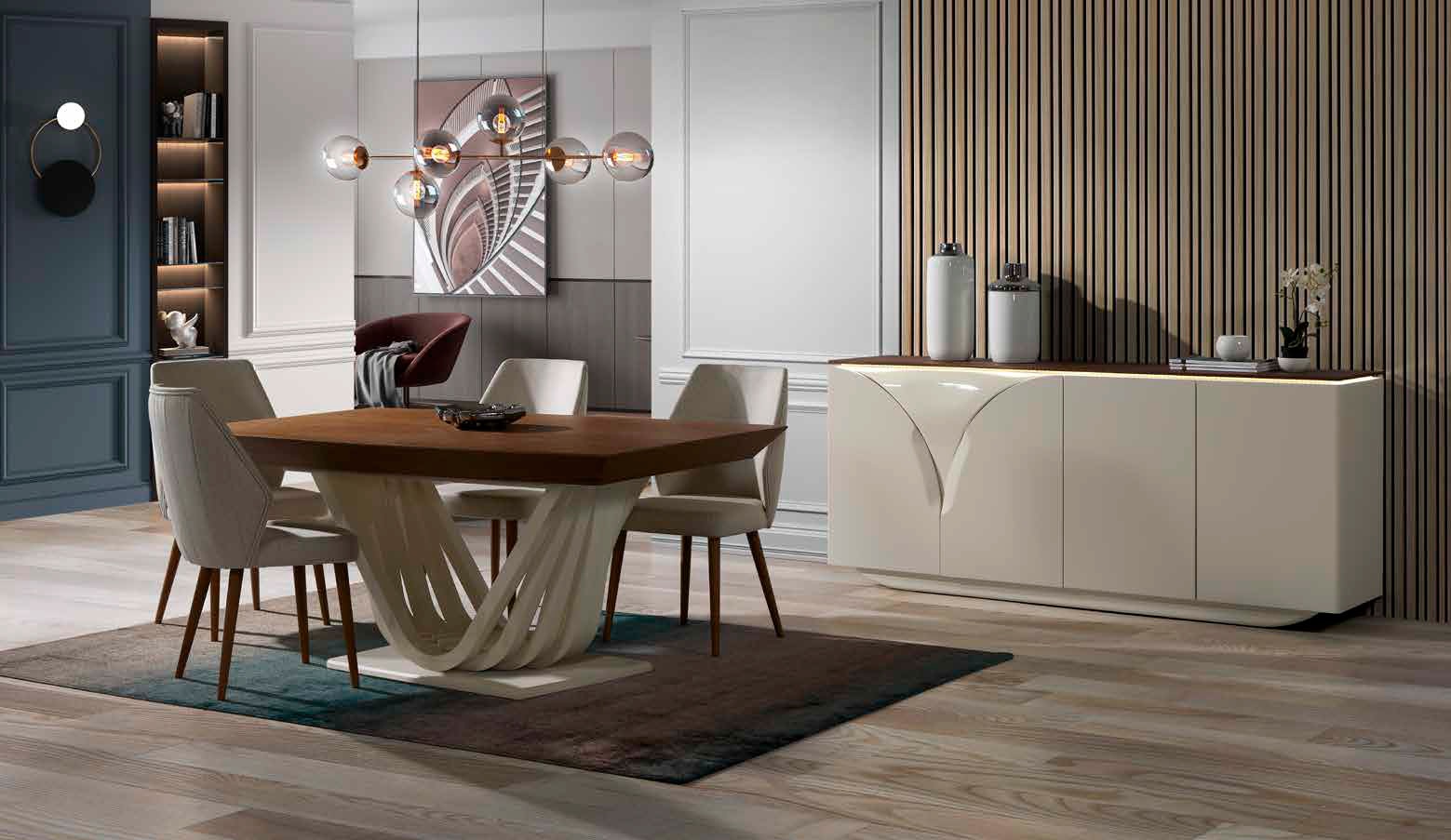 O preço riscado é o preço de venda recomendado de mercado. Dimensões: Aparadro 4 portas: L 200 / P 45 / A 93 Espelho: L 180 / A 60 Mesa extensível: L 160-230 / P 90 / A 77 Cadeira Maty costa estofada Seleccione a combinação de produtos que pretende e o tipo de acabamento. Tempo fabrico estimado, 4 semanas.