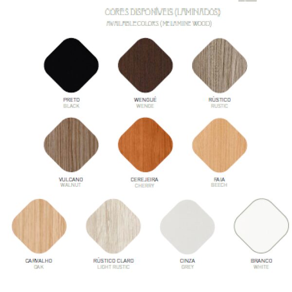Mobiliário fabricado com madeira de Pinho maciça, folha de madeira, aglomerado de madeira e MDF.